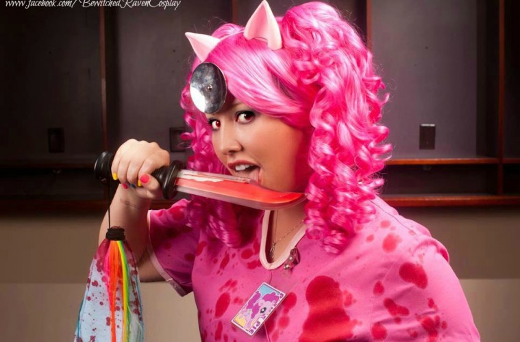 BR: I LOVE doing Cupcakes Pinkie Pie, it’s based off this video, http://youtu.be/43AuJjuxqAw,when I first saw this I nearly died laughing. It’s so sick and twisted. It brought a whole new crazy to Pinkie Pie, and I knew immediately that I wanted to create it, but wasn’t sure the best way. Then, it just dawned on me to use scrubs. My favorite part is that some of the “blood” on the costume is actually red glitter, cause I feel like that would be what is inside a pony.